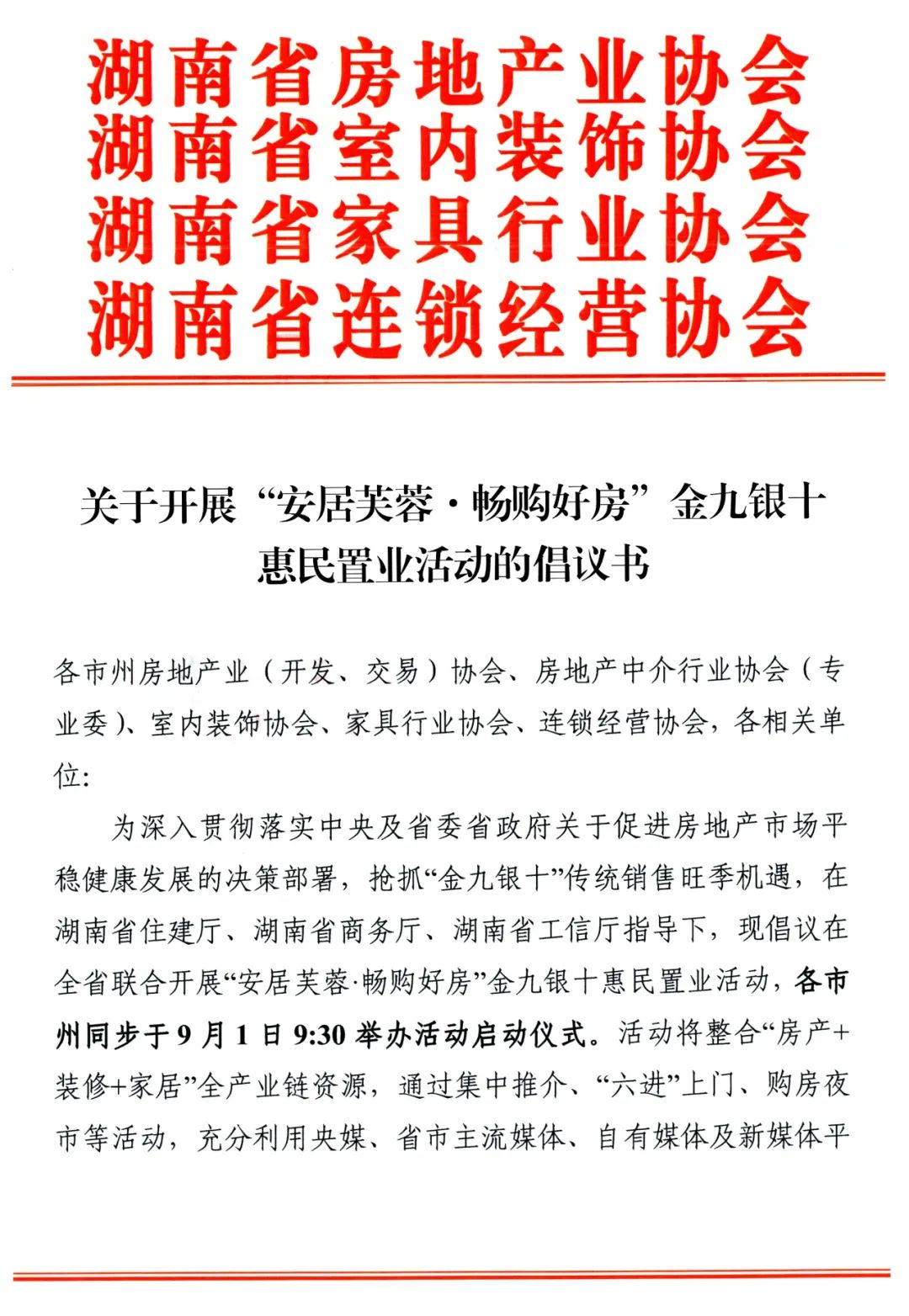 關(guān)于開(kāi)展“安居芙蓉·暢購(gòu)好房”金九銀十惠民置業(yè)活動(dòng)的倡議書