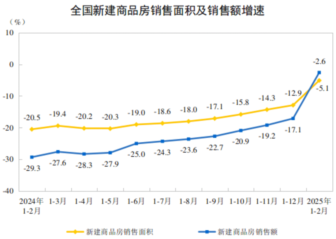 根據(jù)國家統(tǒng)計(jì)局?jǐn)?shù)據(jù),1-2月份,新建商品房銷售面積10746萬平方米,同比下降5.1%,降幅比上年全年收窄7.8個(gè)百分點(diǎn);其中住宅銷售面積下降3.4%,降幅收窄10.7個(gè)百分點(diǎn)。新建商品房銷售額10259億元,下降2.6%,降幅收窄14.5個(gè)百分點(diǎn);其中住宅銷售額下降0.4%,降幅收窄17.2個(gè)百分點(diǎn)。