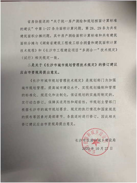 同時(shí),長(zhǎng)沙市住房和城鄉(xiāng)建設(shè)局給予了官方書面意見回復(fù)。對(duì)建議所提及的面積計(jì)算統(tǒng)一標(biāo)準(zhǔn),市建設(shè)局表示為深入貫徹落實(shí)黨中央、國(guó)務(wù)院和省委、省政府關(guān)于深化“放管服”改革和優(yōu)化營(yíng)商環(huán)境的部署要求,今年6月湖南省自然資源廳等8部委聯(lián)合發(fā)布了《關(guān)于湖南省工程建設(shè)項(xiàng)目“多測(cè)合一”改革的意見》,目前實(shí)施細(xì)則正在討論編制中,預(yù)計(jì)近期將推出,可完善解決協(xié)會(huì)提出的大部分問(wèn)題。