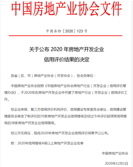 附件:關(guān)于公布2020年房地產(chǎn)開發(fā)企業(yè)信用評價結(jié)果的決定