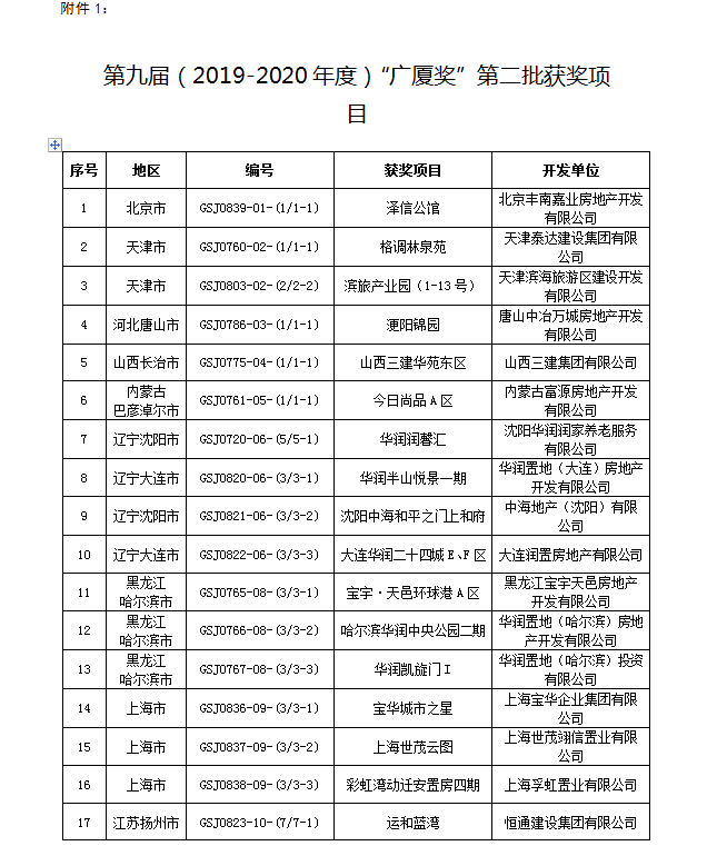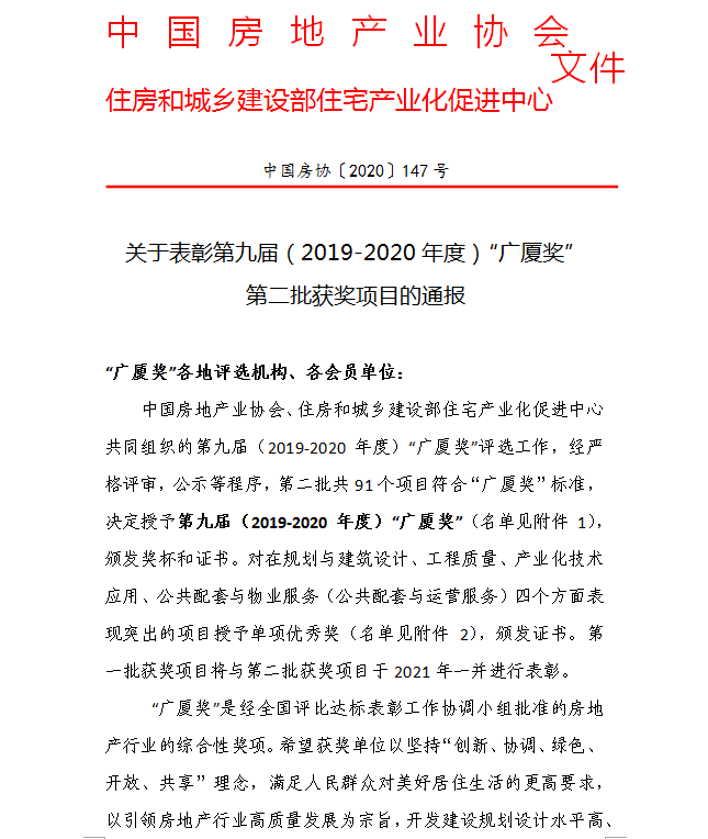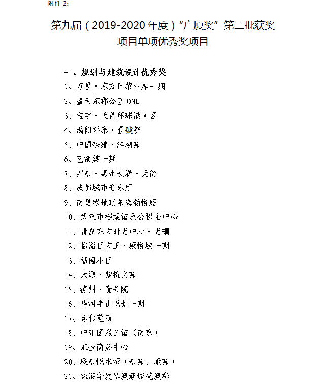 (附:關于表彰第九屆(2019—2020年度)“廣廈獎”第二批獲獎項目的通報)