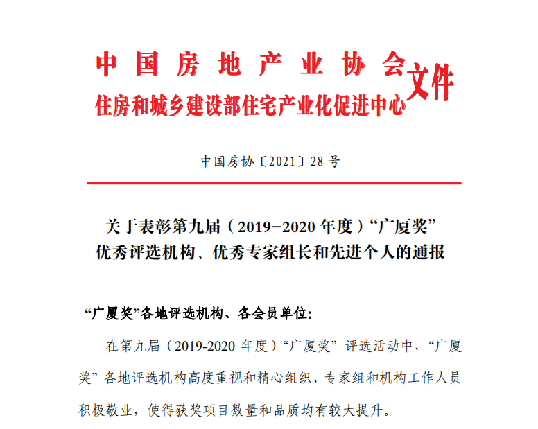 2021年3月16日,中國房地產(chǎn)業(yè)協(xié)會(huì)、住房和城鄉(xiāng)建設(shè)部住宅產(chǎn)業(yè)化促進(jìn)中心發(fā)布了《關(guān)于表彰第九屆(2019-2020年度)“廣廈獎(jiǎng)”優(yōu)秀評(píng)選機(jī)構(gòu)、優(yōu)秀專家組長和先進(jìn)個(gè)人的通報(bào)》。