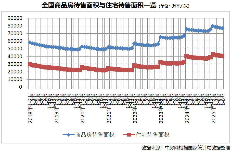 此外,從商品房庫存看,連續(xù)四個(gè)月減少。截至6月末,商品房待售面積76948萬平方米,比5月末減少479萬平方米。其中,住宅待售面積40821萬平方米,減少443萬平方米。