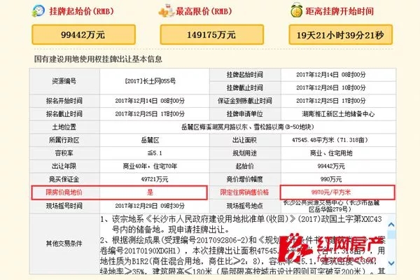 根據(jù)交易條件,該地塊最高限價為149175萬元(折合樓面地價6152元/平方米),該宗住宅用地限定房屋銷售價為9970元/平方米(精裝修價格不計入房屋銷售價,精裝修價格由住建委按規(guī)定確定,下同)。同時,該宗地達到土地交易最高限價時,則按《長沙市住宅用地“限房價、競地價”試點操作規(guī)則》和《長沙市國土資源交易現(xiàn)場搖號操作實施細則》的規(guī)定進行資格審查,資格審查合格的競買人方可參與現(xiàn)場搖號。