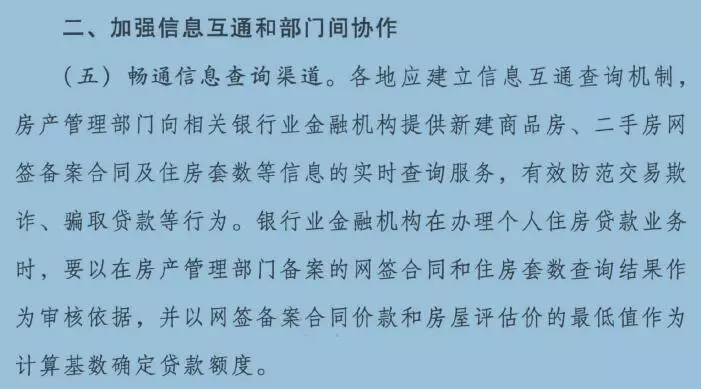 通知要求各地房產(chǎn)管理部門(mén)、地方金融監(jiān)管部門(mén)會(huì)同人民銀行、銀監(jiān)會(huì)各派出機(jī)構(gòu)建立聯(lián)動(dòng)工作機(jī)制,加強(qiáng)信息互通和部門(mén)間協(xié)作。各地房產(chǎn)管理部門(mén)要向相關(guān)銀行業(yè)金融機(jī)構(gòu)提供新建商品房、二手房網(wǎng)簽備案合同及住房套數(shù)等信息的實(shí)時(shí)查詢(xún)服務(wù),銀行業(yè)金融機(jī)構(gòu)在辦理個(gè)人住房貸款業(yè)務(wù)時(shí),要以在房產(chǎn)管理部門(mén)備案的網(wǎng)簽合同和住房套數(shù)查詢(xún)結(jié)果作為審核依據(jù),并以網(wǎng)簽備案合同價(jià)款和房屋評(píng)估價(jià)的最低值作為計(jì)算基數(shù)確定貸款額度,有效防范交易欺詐、騙取貸款等行為。