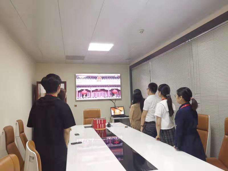 中原集團:中共中原(湖南)房地產代理有限公司黨支部組織全體黨員及員工認真觀看慶祝建黨100周年大會直播,當國歌響起全體黨員自覺起立唱起國歌。