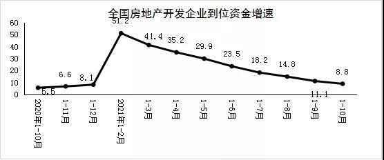 1—10月,全國房地產(chǎn)開發(fā)企業(yè)到位資金166597億元,同比增長8.8%;比2019年1—10月份增長14.8%,兩年平均增長7.1%。其中,國內(nèi)貸款20148億元,下降10.0%;利用外資72億元,下降35.4%;自籌資金52617億元,增長5.1%;定金及預收款62040億元,增長21.0%;個人按揭貸款26678億元,增長9.7%。