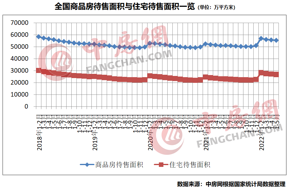 此外,在庫(kù)存方面,自年初創(chuàng)下階段新高后,已連續(xù)出現(xiàn)回落態(tài)勢(shì)。截至5月末,商品房待售面積55433萬(wàn)平方米,同比增長(zhǎng)8.6%。其中,住宅待售面積26815萬(wàn)平方米,同比增長(zhǎng)15%。