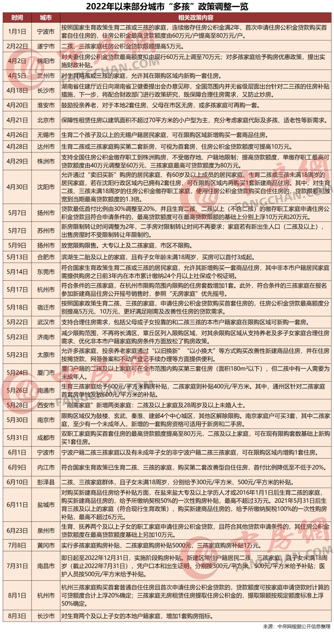 此后,全國多地陸續(xù)對多孩政策進(jìn)行了調(diào)整。據(jù)中房網(wǎng)不完全統(tǒng)計,自年初以來全國約有超過30個城市,出臺相關(guān)政策35余次。內(nèi)容涉及提高公積金貸款額度、實施優(yōu)惠利率、出臺購房補(bǔ)貼,以及“松綁”限購和限售等方式,給予多孩家庭更多的購房支持。