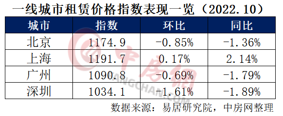近日,由易居企業(yè)集團(tuán)、上海易居房地產(chǎn)研究院、華東師范大學(xué)東方房地產(chǎn)研究院三方共同發(fā)布的《中國城市住房租賃價格指數(shù)報告》顯示,2022年10月,中國城市租賃價格指數(shù)為1022.5點(diǎn),較上月下降5.2點(diǎn),環(huán)比下跌0.50%,同比跌幅1.04%。
