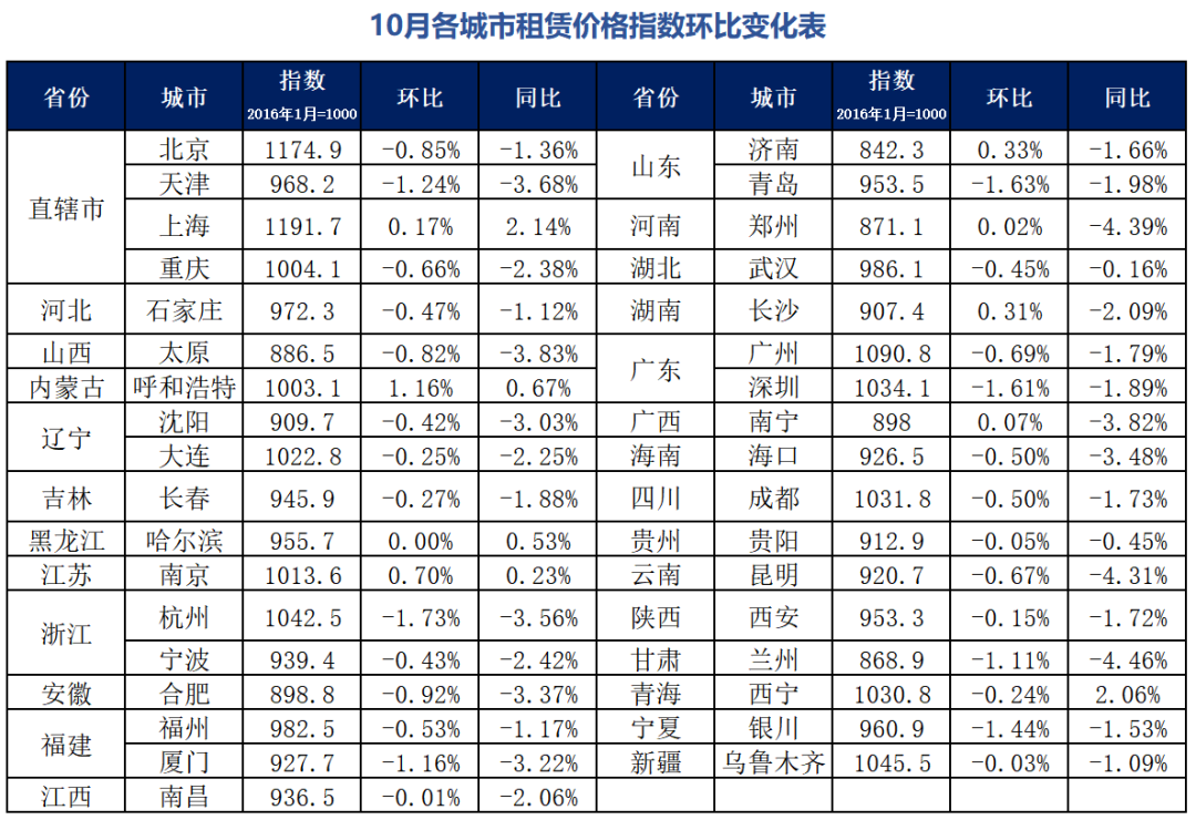 從環(huán)比方面看,監(jiān)控的35個城市中,呼和浩特(1.16%)、南京(0.70%)、濟(jì)南(0.33%)、長沙(0.31%)、上海(0.17%)、南寧(0.07%)和鄭州(0.02%)7個城市租賃價格指數(shù)出現(xiàn)上漲,上漲城市數(shù)量比9月份增加5個。有27個城市(南昌、烏魯木齊、貴陽、西安、西寧、大連、長春、沈陽、寧波、武漢、石家莊、海口、成都、福州、重慶、昆明、廣州、太原、北京、合肥、蘭州、廈門、天津、銀川、深圳、青島、杭州)租賃價格指數(shù)出現(xiàn)不同程度下跌,下跌城市數(shù)量比9月份減少5個。其中,杭州(-1.73%)、青島(-1.63%)和深圳(-1.61%)跌幅靠前,且跌幅均超1.6%。除此之外,僅哈爾濱1個城市租賃價格指數(shù)與9月份持平,且該城市租賃價格指數(shù)已連續(xù)兩個月呈持平態(tài)勢。