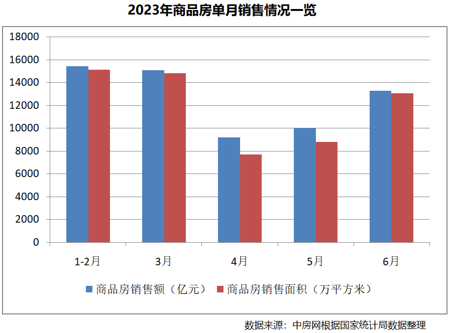 從單月銷售情況來(lái)看,根據(jù)國(guó)家統(tǒng)計(jì)局?jǐn)?shù)據(jù)拆分后測(cè)算,6月份商品房銷售面積為13075萬(wàn)平方米,環(huán)比上漲48.51%,同比下降28.10%。商品房銷售額13305億元,環(huán)比上漲32.56%,同比下降24.98%。