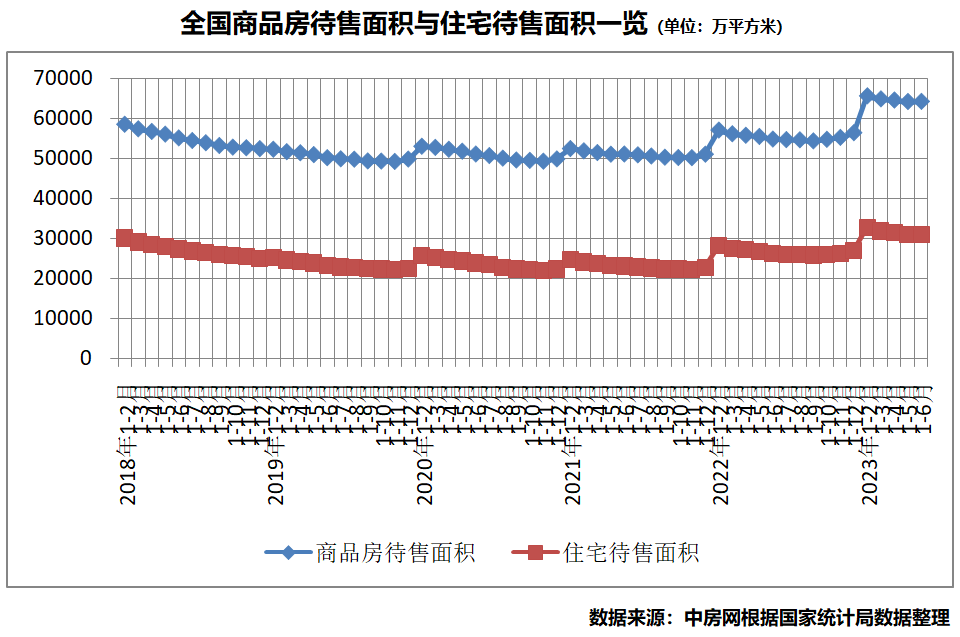庫(kù)存方面,6月份商品房待售面積在連續(xù)三個(gè)月下降后有所回升,而住宅待售面積則繼續(xù)小幅下降。根據(jù)國(guó)家統(tǒng)計(jì)局?jǐn)?shù)據(jù),截至6月末,商品房待售面積64159萬(wàn)平方米,同比增長(zhǎng)17.0%。其中,住宅待售面積為31006萬(wàn)平方米,同比增長(zhǎng)18.0%。