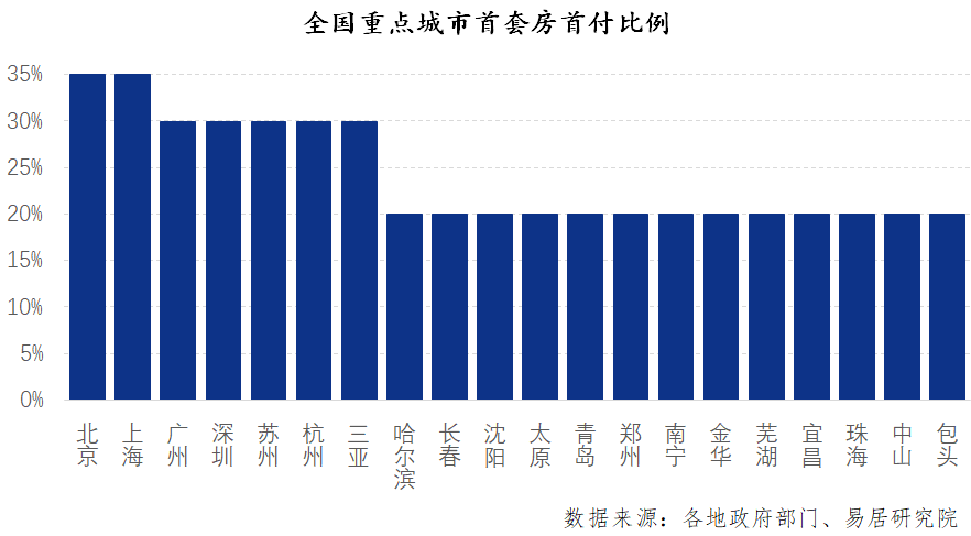 根據(jù)易居研究院監(jiān)測,目前全國20個重點城市首套房首付比例平均值為24%,首付比例主要分為35%、30%和20%三檔。