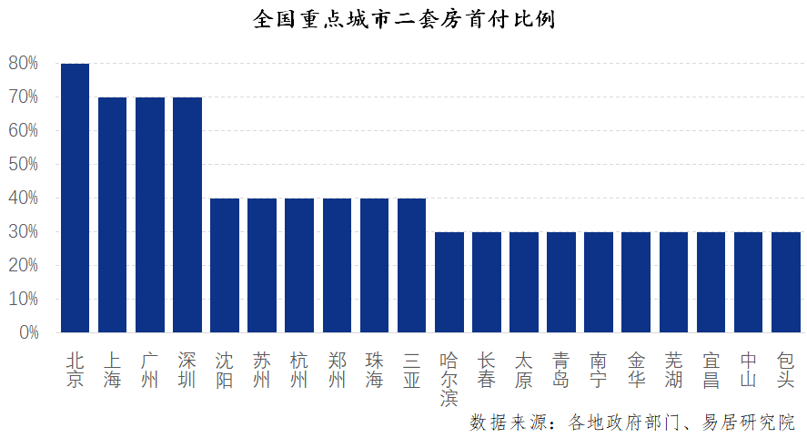 具體來看,北京二套房的首付比例最高,最多可達80%;上海、廣州和深圳也高達70%。此外,包括哈爾濱、長春和太原等二線城市,其二套房的首付比例僅為30%的水平。