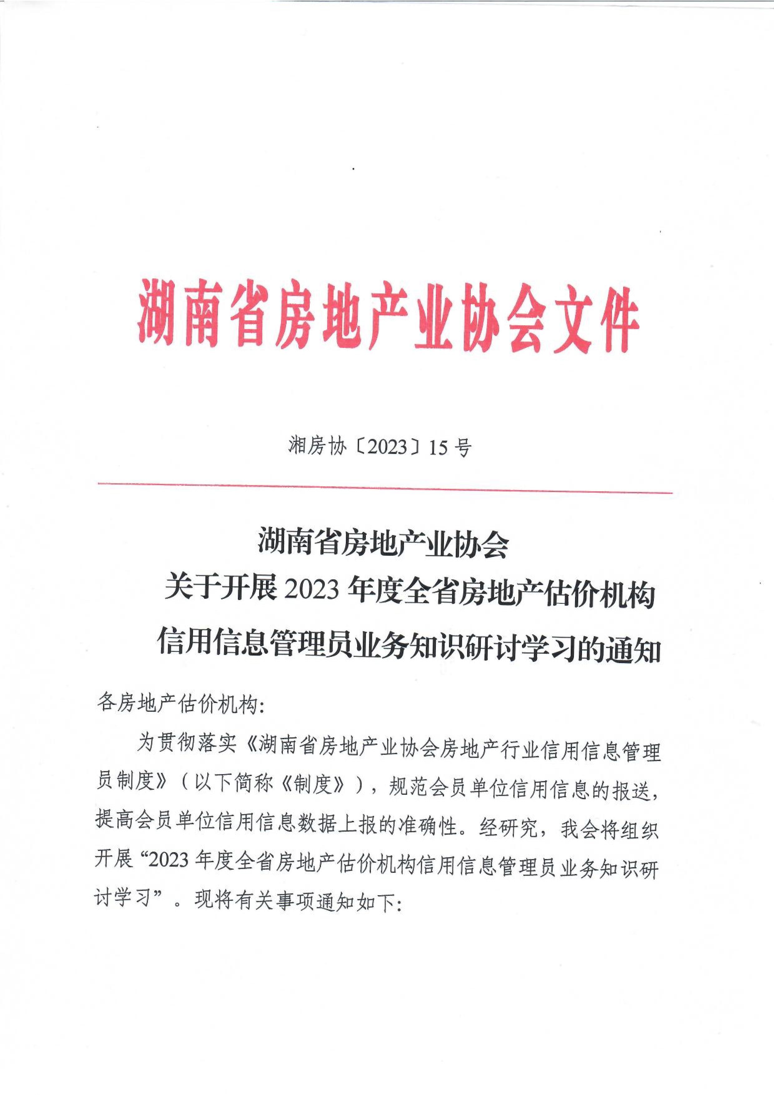 為貫徹落實(shí)《湖南省房地產(chǎn)業(yè)協(xié)會(huì)房地產(chǎn)行業(yè)信用信息管理員制度》(以下簡(jiǎn)稱《制度》),規(guī)范會(huì)員單位信用信息的報(bào)送,提高會(huì)員單位信用信息數(shù)據(jù)上報(bào)的準(zhǔn)確性。經(jīng)研究,我會(huì)將組織開展“2023年度全省房地產(chǎn)估價(jià)機(jī)構(gòu)信用信息管理員業(yè)務(wù)知識(shí)研討學(xué)習(xí)”?,F(xiàn)將有關(guān)事項(xiàng)通知如下:
