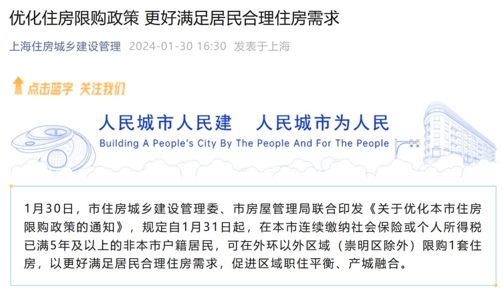 1月30日,上海市住建委、市房管局聯(lián)合印發(fā)通知,對(duì)住房限購(gòu)政策進(jìn)行優(yōu)化。通知規(guī)定,自1月31日起,在上海市連續(xù)繳納社會(huì)保險(xiǎn)或個(gè)人所得稅已滿5年及以上的非本市戶籍居民,可在外環(huán)以外區(qū)域(崇明區(qū)除外)限購(gòu)1套住房。