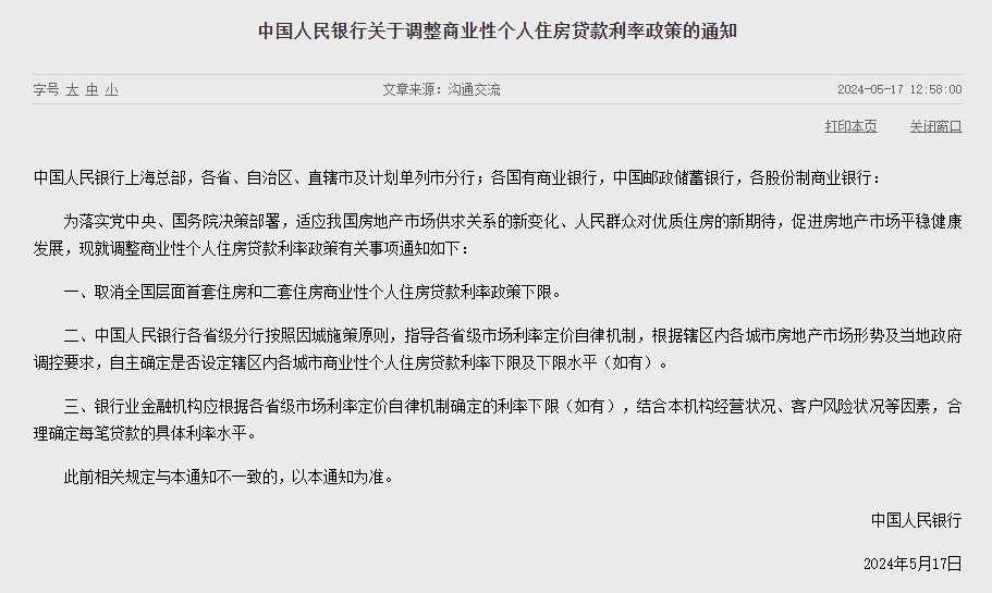 中國(guó)人民銀行上??偛?,各省、自治區(qū)、直轄市及計(jì)劃單列市分行;各國(guó)有商業(yè)銀行,中國(guó)郵政儲(chǔ)蓄銀行,各股份制商業(yè)銀行:為落實(shí)黨中央、國(guó)務(wù)院決策部署,適應(yīng)我國(guó)房地產(chǎn)市場(chǎng)供求關(guān)系的新變化、人民群眾對(duì)優(yōu)質(zhì)住房的新期待,促進(jìn)房地產(chǎn)市場(chǎng)平穩(wěn)健康發(fā)展,現(xiàn)就調(diào)整商業(yè)性個(gè)人住房貸款利率政策有關(guān)事項(xiàng)通知如下:一、取消全國(guó)層面首套住房和二套住房商業(yè)性個(gè)人住房貸款利率政策下限。