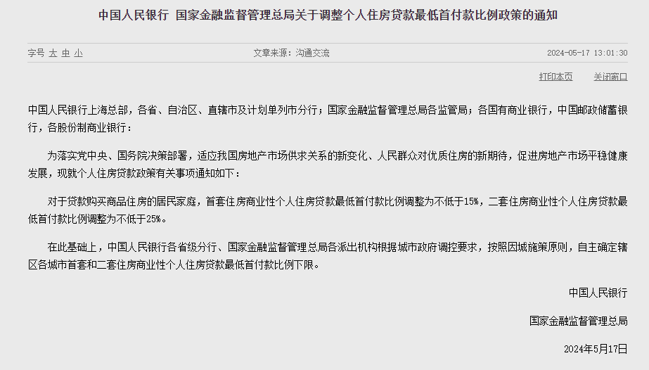 中國(guó)人民銀行 國(guó)家金融監(jiān)督管理總局關(guān)于調(diào)整個(gè)人住房貸款最低首付款比例政策的通知