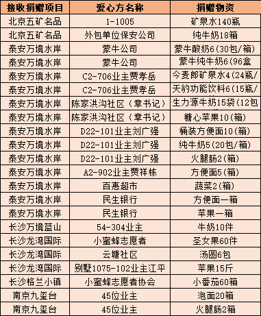 注:以上愛心捐贈信息統(tǒng)計(jì)截止于2月19日,愛心正在源源不斷遞增;以上數(shù)量單位經(jīng)換算為統(tǒng)一單位;以上圖片均為真實(shí)圖片,但因排版有限,部分愛心人士捐贈圖片未列入,請諒解。
