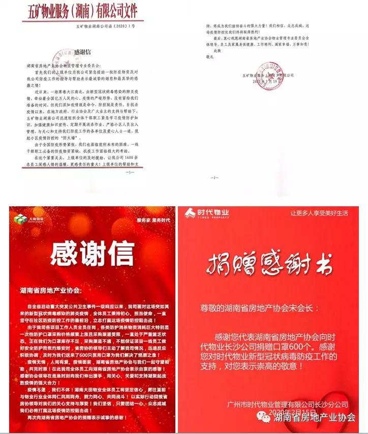 協(xié)會的抗疫工作得到越來越多的肯定,物業(yè)協(xié)會、開發(fā)協(xié)會、物業(yè)服務公司等等紛紛發(fā)來感謝信。行業(yè)組織帶頭,全力保障企業(yè)抗疫,廣大業(yè)主們也積極行動起來,防疫一線涌現(xiàn)了許多溫馨感人的畫面:在五礦龍灣國際項目業(yè)主們自發(fā)捐了一大批橡膠手套、體溫計、一次性口罩、84消毒液等助力防控疫情。在湖南建工匯博物業(yè)管理有限公司五公司岳陽生活區(qū)項目,一位不愿意留名的業(yè)主捐贈5000元,對小區(qū)物業(yè)說:“你們辛苦了,希望為疫情防控出一份力!”