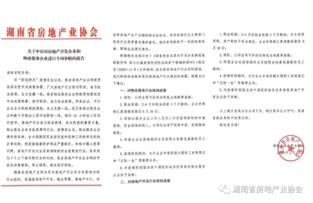 疫情過后行業(yè)如何迅速恢復生產,健康發(fā)展是省房協(xié)關切的重點。針對開發(fā)、物業(yè)、中介、評估行業(yè)普遍存在的困難,我會向湖南省財政廳、湖南省稅務局分別提交了《關于申請對房地產開發(fā)企業(yè)和物業(yè)服務企業(yè)進行專項補貼的報告》,為行業(yè)爭取扶持政策,幫助企業(yè)渡過難關。省住建廳領導非常重視,廳領導親自指導并過問“報告”起草工作,省住建廳房產處也積極與省財政廳、省稅務局、省發(fā)改委等相關部門多次對接積極爭取政策幫助。在廣泛調研后,我會擬定的“政策建議報告”現(xiàn)已分別上報省財政廳、省稅務局。國家稅務總局湖南省稅務局在認真研究我會的政策建議報告,于2月18日針對建議逐一給予了回復,并表示會進一步重視并支持疫情期間物業(yè)服務行業(yè)和開發(fā)行業(yè)的減負工作,尤其將部分我會提出的重點建議條款反饋至上級部門爭取能得到政策支持。