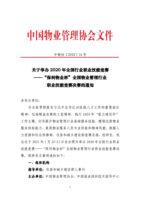 剛剛,中國物業(yè)管理協(xié)會發(fā)布了《關于舉辦2020年全國行業(yè)職業(yè)技能競賽——“保利物業(yè)杯”全國物業(yè)管理行業(yè)職業(yè)技能競賽決賽的通知》,兩年一屆的全國總決賽終于塵埃落定。