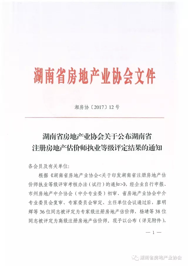 湖南省房地產(chǎn)業(yè)協(xié)會關(guān)于公布湖南省注冊房地產(chǎn)估價(jià)師執(zhí)業(yè)等級評定結(jié)果的通知