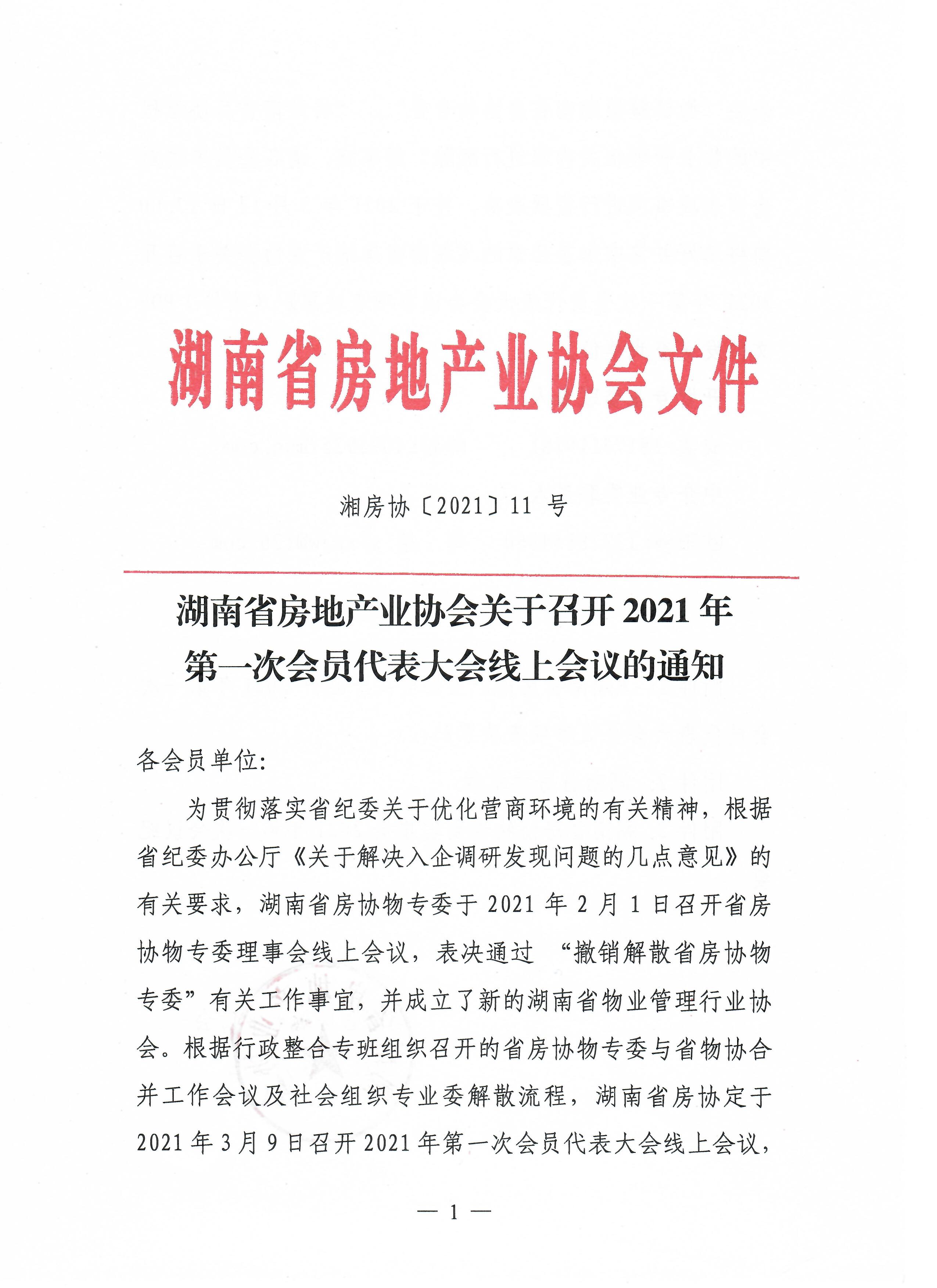 湖南省房地產(chǎn)業(yè)協(xié)會關于召開2021年第一次會員代表大會線上會議的通知