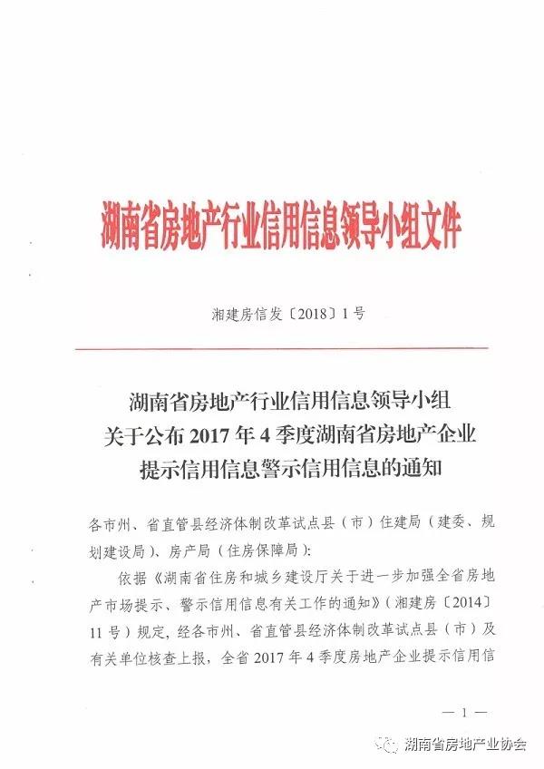湖南省房地產(chǎn)行業(yè)信用信息領(lǐng)導(dǎo)小組關(guān)于公布2017年4季度湖南省房地產(chǎn)企業(yè)提示信用信息警示信用信息的通知