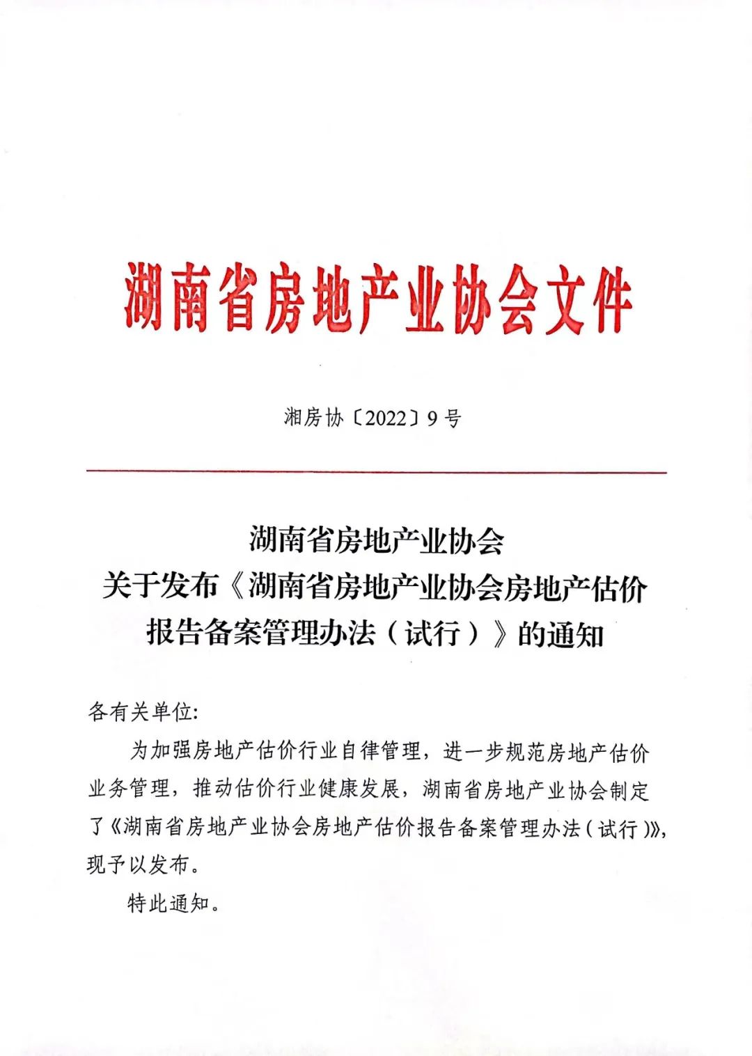 關(guān)于發(fā)布《湖南省房地產(chǎn)業(yè)協(xié)會(huì)房地產(chǎn)估價(jià)報(bào)告?zhèn)浒腹芾磙k法(試行)》的通知