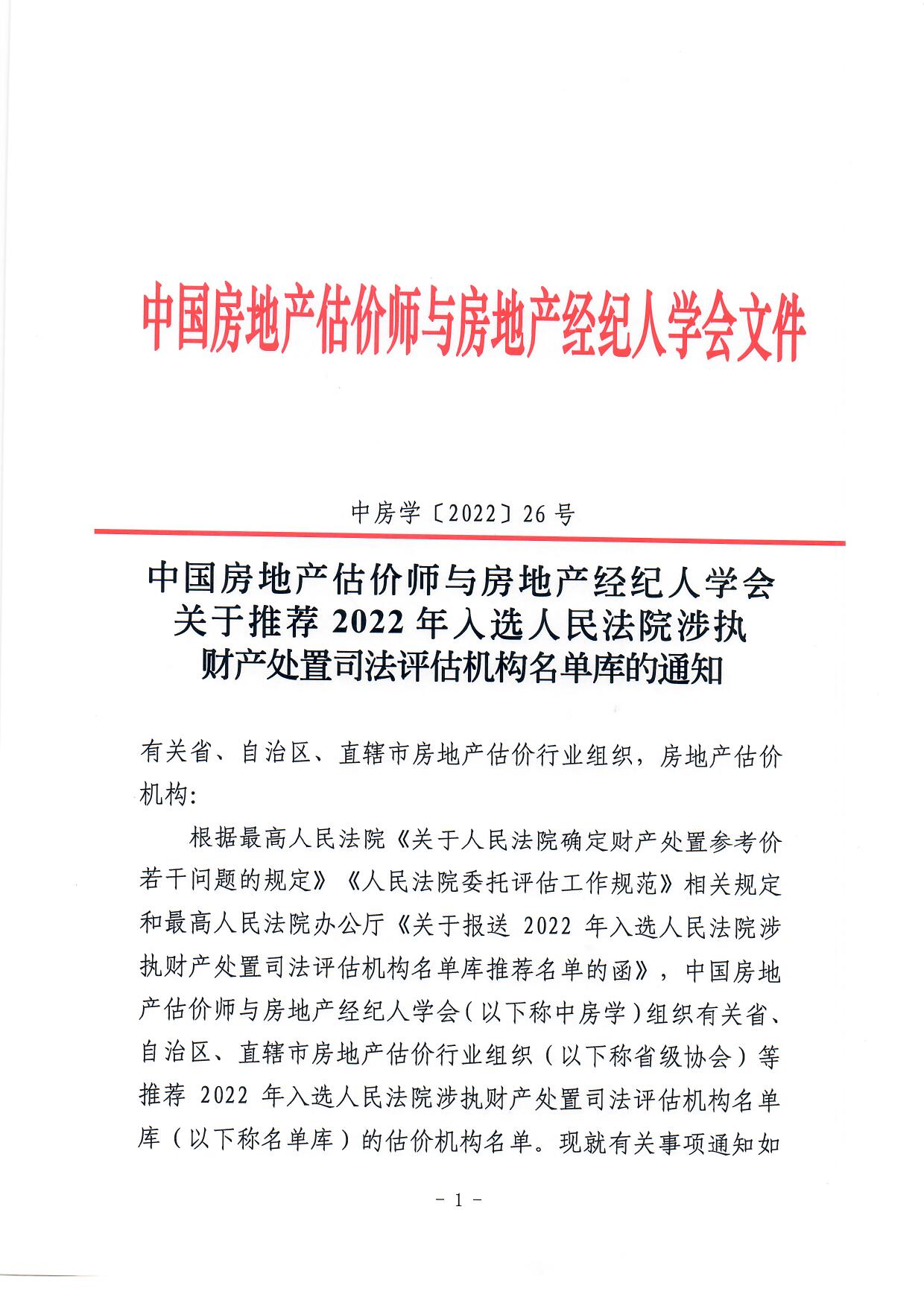 轉(zhuǎn)發(fā)中房學(xué)《關(guān)于推薦2022年入選人民法院涉執(zhí)財產(chǎn)處置司法評估機(jī)構(gòu)名單庫的通知》