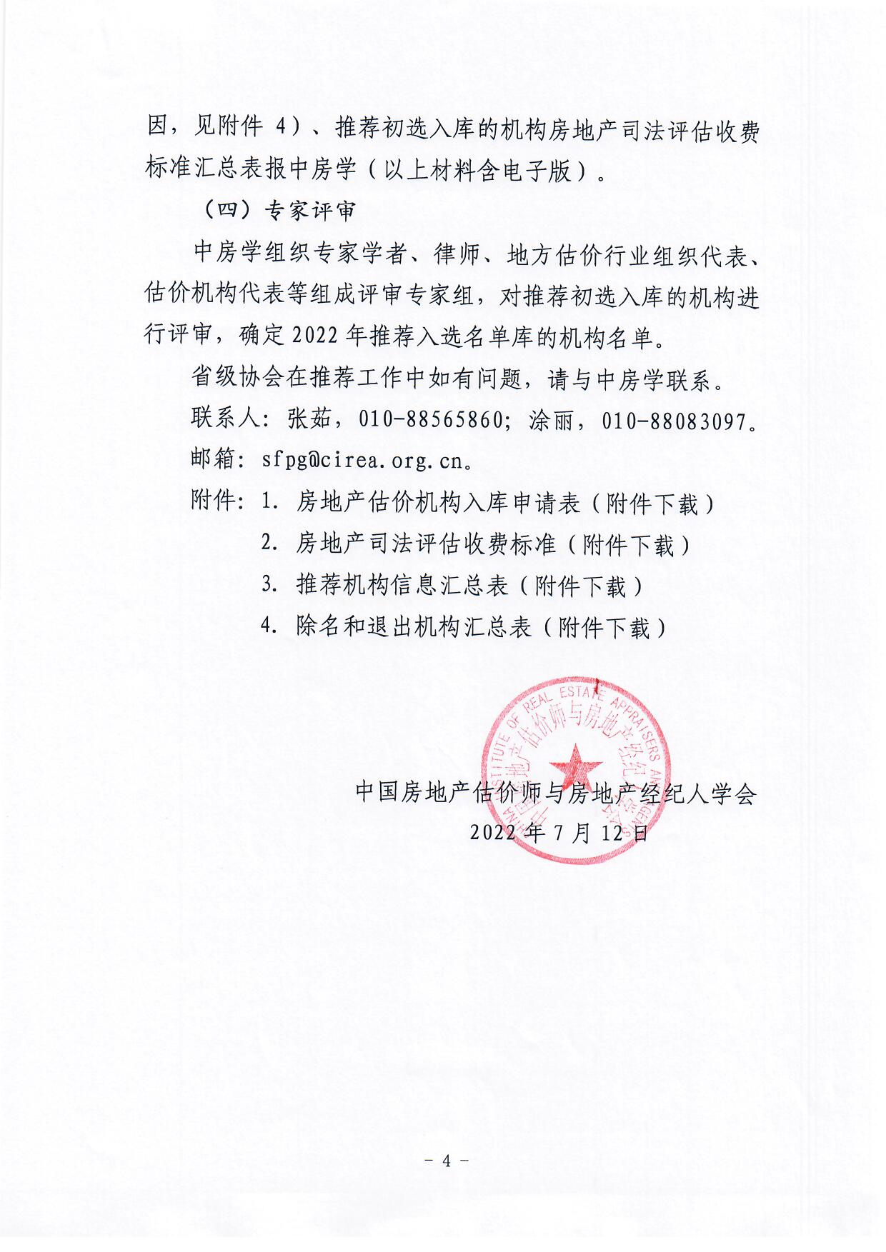 為配合中房學(xué)做好司法評估業(yè)務(wù)的房地產(chǎn)估價機(jī)構(gòu)名單庫推選工作,現(xiàn)將中國房地產(chǎn)估價師與房地產(chǎn)經(jīng)紀(jì)人學(xué)會《關(guān)于推薦2022年入選人民法院涉執(zhí)財產(chǎn)處置司法評估機(jī)構(gòu)名單庫的通知》(中房學(xué)〔2022〕26號),轉(zhuǎn)發(fā)給各有關(guān)單位并將有關(guān)事項補充如下: