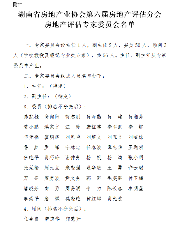 關(guān)于湖南省房地產(chǎn)業(yè)協(xié)會(huì)第六屆房地產(chǎn)評(píng)估分會(huì)房地產(chǎn)評(píng)估專家委員會(huì)名單的公示