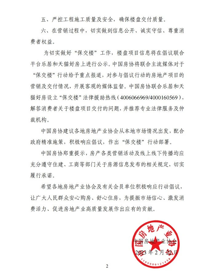 據(jù)悉,未來中國房協(xié)還將通過直播方式,舉行中國房地產(chǎn)業(yè)“保交樓”行動倡議發(fā)布會,敬請關(guān)注。