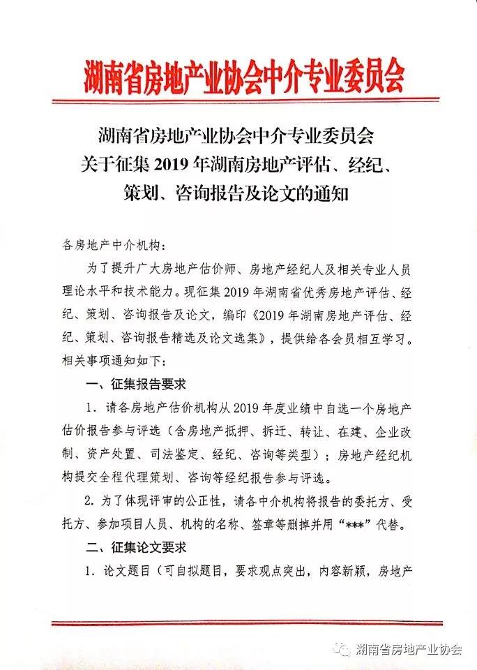 關(guān)于征集2019年湖南房地產(chǎn)評估、經(jīng)紀、 策劃、咨詢報告及論文的通知