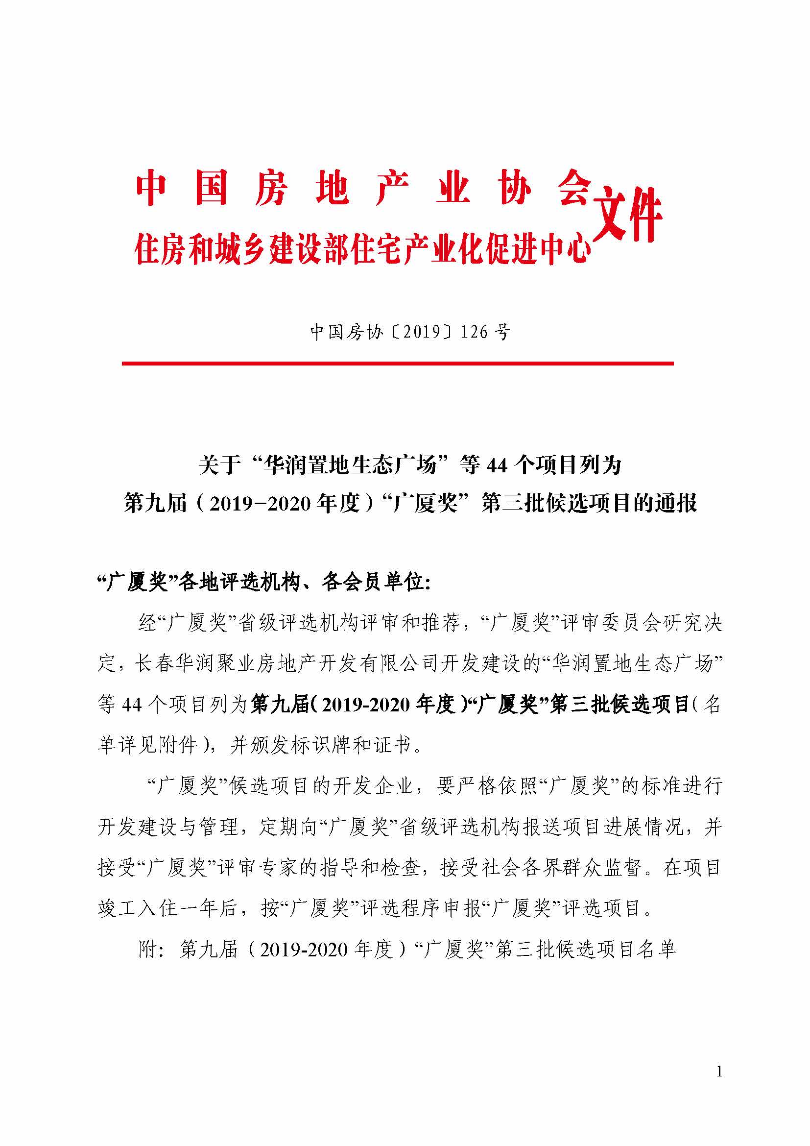 關(guān)于“華潤(rùn)置地生態(tài)廣場(chǎng)”等 44 個(gè)項(xiàng)目列為第九屆(2019-2020 年度)“廣廈獎(jiǎng)”第三批候選項(xiàng)目的通報(bào)