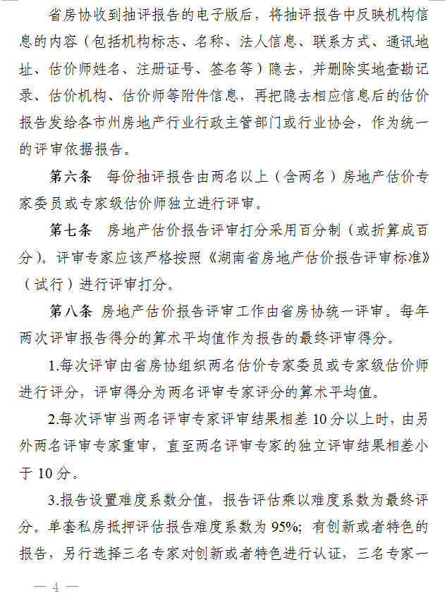 三、《辦法》第八條修改為:“房地產(chǎn)估價報告評審工作由省房協(xié)統(tǒng)一評審。每年兩次評審報告得分的算術(shù)平均值作為報告的最終評審得分。1.每次評審由省房協(xié)組織兩名估價專家委員或?qū)<壹壒纼r師進行評分,評審得分為兩名評審專家評分的算術(shù)平均值。2.每次評審當(dāng)兩名評審專家評審結(jié)果相差10分以上時,由另外兩名評審專家重審,直至兩名評審專家的獨立評審結(jié)果相差小于10分。3.報告設(shè)置難度系數(shù)分值,報告評估乘以難度系數(shù)為最終評分。單套私房抵押評估報告難度系數(shù)為95%;有創(chuàng)新或者特色的報告,另行選擇三名專家對創(chuàng)新或者特色進行認(rèn)證,三名專家一致同意后確認(rèn)難度系數(shù),其難度系數(shù)分值區(qū)間為105%—110% ?!?/span>
