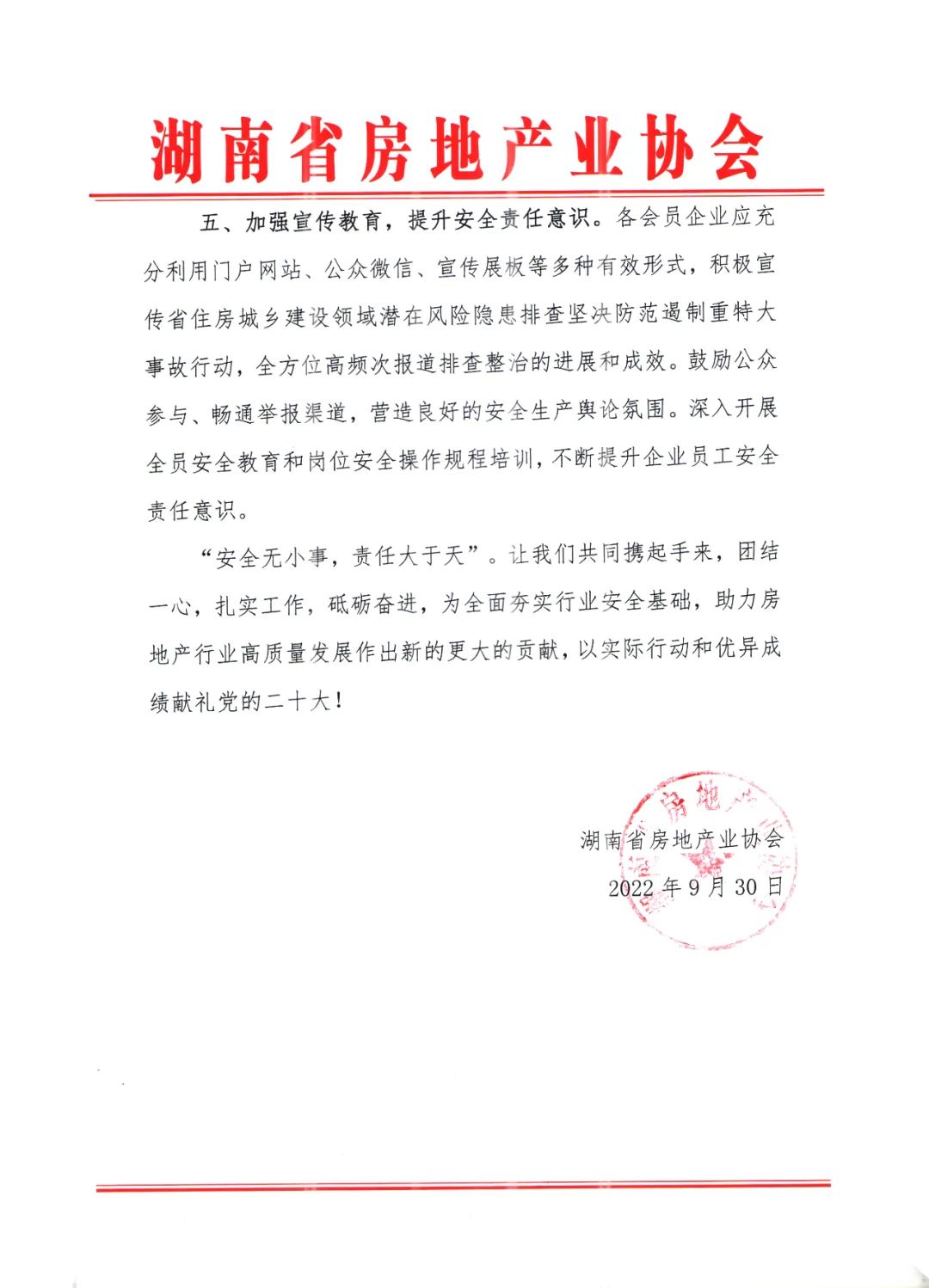 為切實(shí)貫徹落實(shí)習(xí)近平總書(shū)記關(guān)于安全生產(chǎn)工作的重要論述和重要指示批示精神,深刻汲取近期省內(nèi)外生產(chǎn)安全事故教訓(xùn),有效防范化解房地產(chǎn)行業(yè)安全風(fēng)險(xiǎn)隱患,確保房地產(chǎn)領(lǐng)域安全生產(chǎn)形勢(shì)穩(wěn)定,根據(jù)《湖南省住房和城鄉(xiāng)建設(shè)廳關(guān)于印發(fā)<湖南省住房和城鄉(xiāng)建設(shè)領(lǐng)域深入排查潛在風(fēng)險(xiǎn)隱患堅(jiān)決防范遏制重特大事故實(shí)施方案>的通知》(湘建明電〔2022〕46號(hào))的有關(guān)要求,我會(huì)向全體會(huì)員企業(yè)發(fā)出如下倡議: