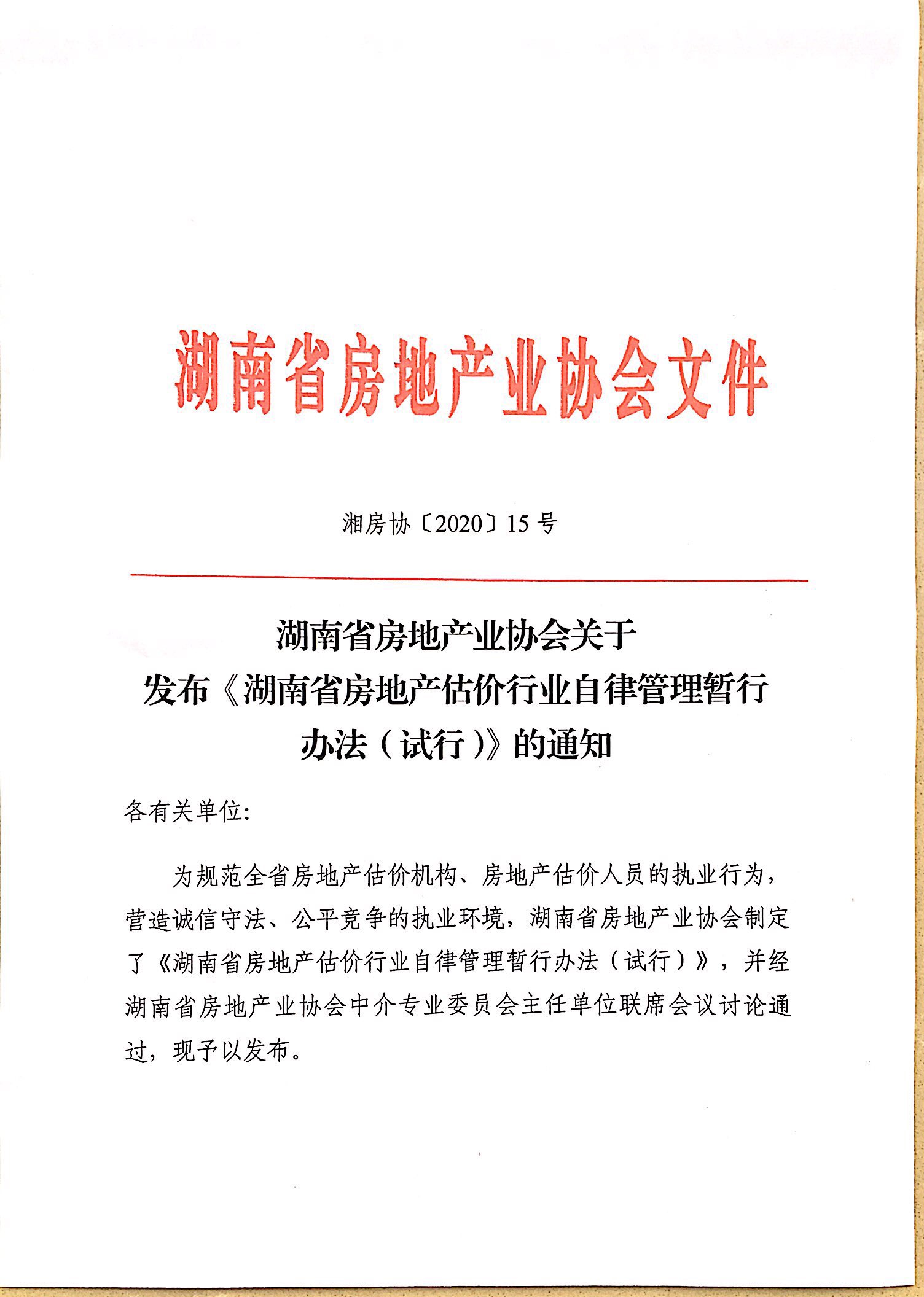 湖南省房地產(chǎn)業(yè)協(xié)會關于發(fā)布《湖南省房地產(chǎn)估價行業(yè)自律管理暫行辦法(試行)》的通知
